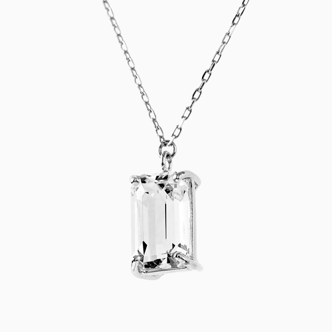 湧き水で丁寧に洗浄された透明度の高いクリスタルを、日本の熟練職人が8×5mmのエメラルドカットに仕上げました。
