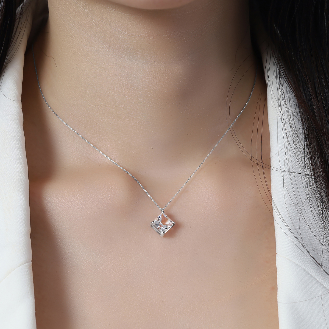 湧き水で丁寧に洗浄された天然クリスタルを、日本の熟練職人が繊細な手仕事でプリンセスカットに仕上げました。